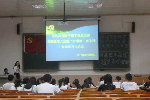 10月20日下午,经济与管理学院于莞城校区5#1顺利召开学生党支部大会,党支部书记邓毅青、全体学生党员及发展对象出席了现场。