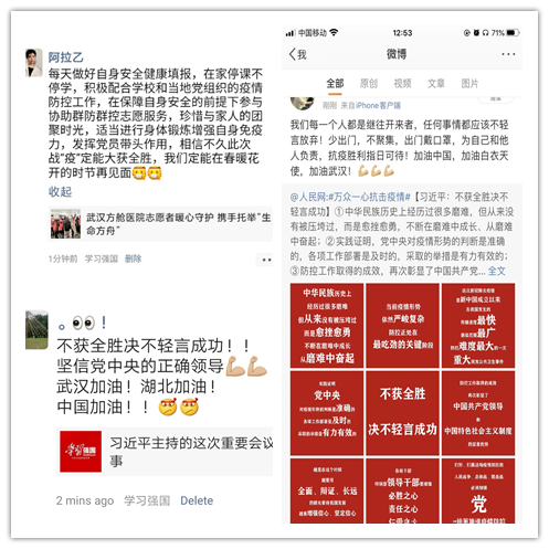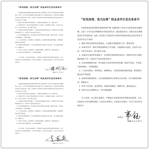 此外,全体学生党员通过微信朋友圈、微博等平台,纷纷发表了个人关于疫情防控的看法与感受,并且签下了“防范疫情、我当先锋”财金系学生党员承诺书。