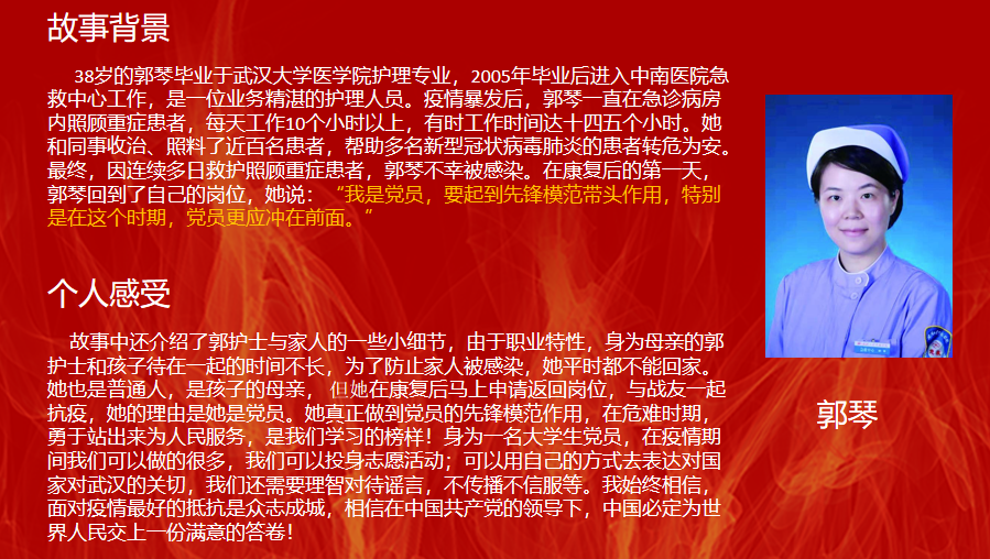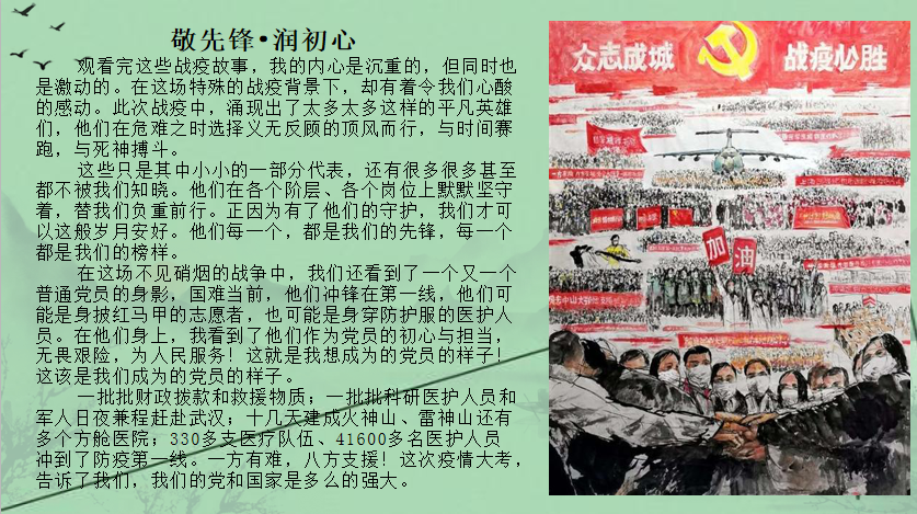 在学习分享会上,党员们通过观看战疫纪录片中的先进事迹、寻找抗疫先锋,并以PPT图片的形式在微信群上展示和分享了自己的心得和体会。党员吴敏珊认为“这次的疫情,他看到各位在一线奋斗的‘战士’们,深深感受到,哪有什么岁月静好,不过是有人替你负重前行。我们应该向这些最美逆行者学习。”党员梁泳琪认为“他们都是我们的英雄,是鲜活的雷锋,是一面旗帜,为我们带来无比强大的温暖与力量。向所有勇敢的逆行雷锋致敬!”党员们纷纷踊跃在线上分享交流自己的感悟,在交流、讨论中,心灵受到洗礼、党性得到了加强。