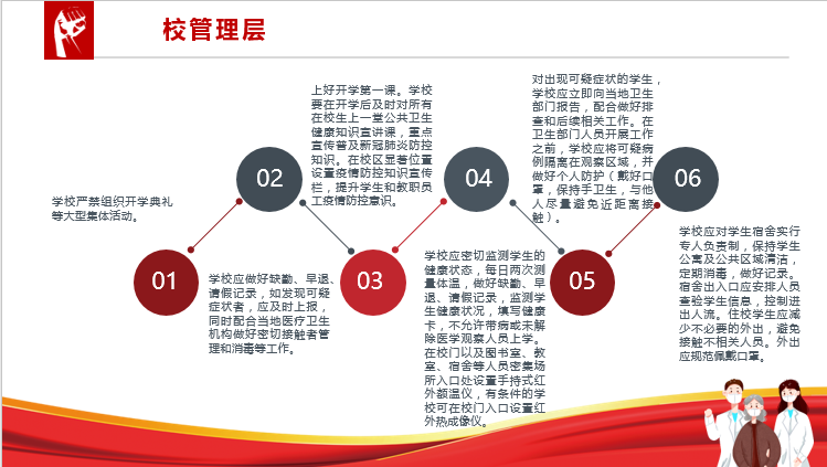 由于不安排集中学习,采取“网络在线学+抗疫一线学+在家党员居家学”模式,将主题党日活动开到防控“疫线”,确保活动全覆盖、有成效,助力疫情防控。因此,在这阶段,学生党员发挥模范作用,了解返校后的疫情防控手段,通过线上媒体等多种渠道了解回校后的疫情防控手段,制作PPT材料。