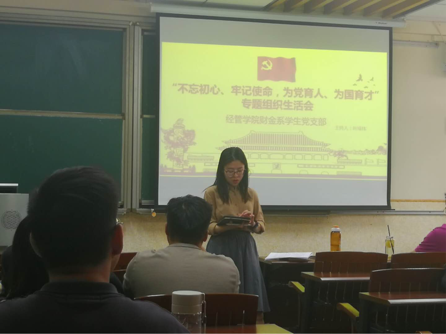 2020年10月22日下午,经济与管理学院财金系学生党支部于莞城校区3308课室举行专题组织生活会。本次会议主题为“不忘初心、牢记使命,为党育人、为国育才”。党支部书记叶琦玮同志担任会议主持人。