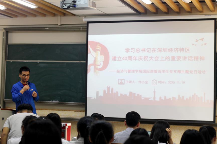 11月19日,经济与管理学院国商系学生党支部于莞城校区3309教室召开了学生党支部主题党日活动。支部书记付小全老师、委员熊涛老师、刘欣颖老师及全体学生党员出席本次会议。