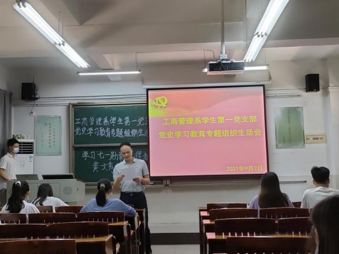 2021年9月2日下午,经济与管理学院工商管理系学生第一党支部于莞城校区2202课室顺利开展党史学习教育专题组织生活会,支部全体学生党员出席了现场,会议由经济与管理学院党委副书记黄湘同志主持。