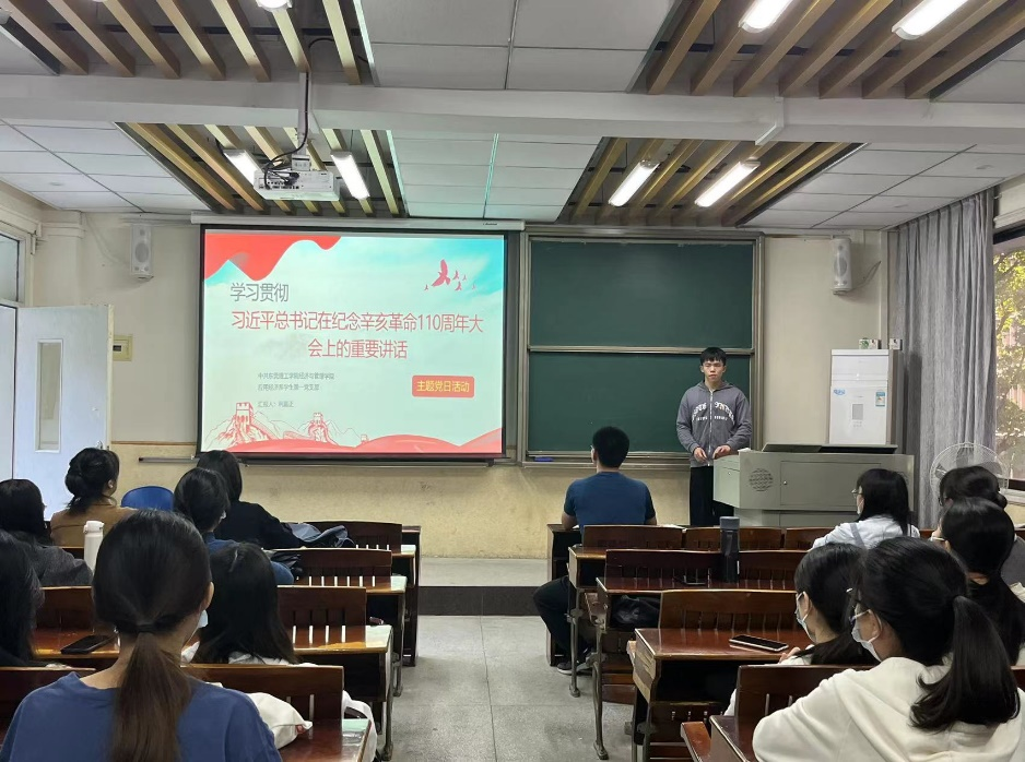 11月11日,经济与管理学院应用经济系学生第一党支部在莞城校区5205开展主题党日,学习贯彻习近平总书记在纪念辛亥革命110周年大会上的重要讲话精神,缅怀在辛亥革命中英勇奋斗的革命先驱,深入解读辛亥革命对新中国历史进程的影响及其提供的宝贵经验与历史启示。会议由支部书记付小全同志主持,全体党员出席。