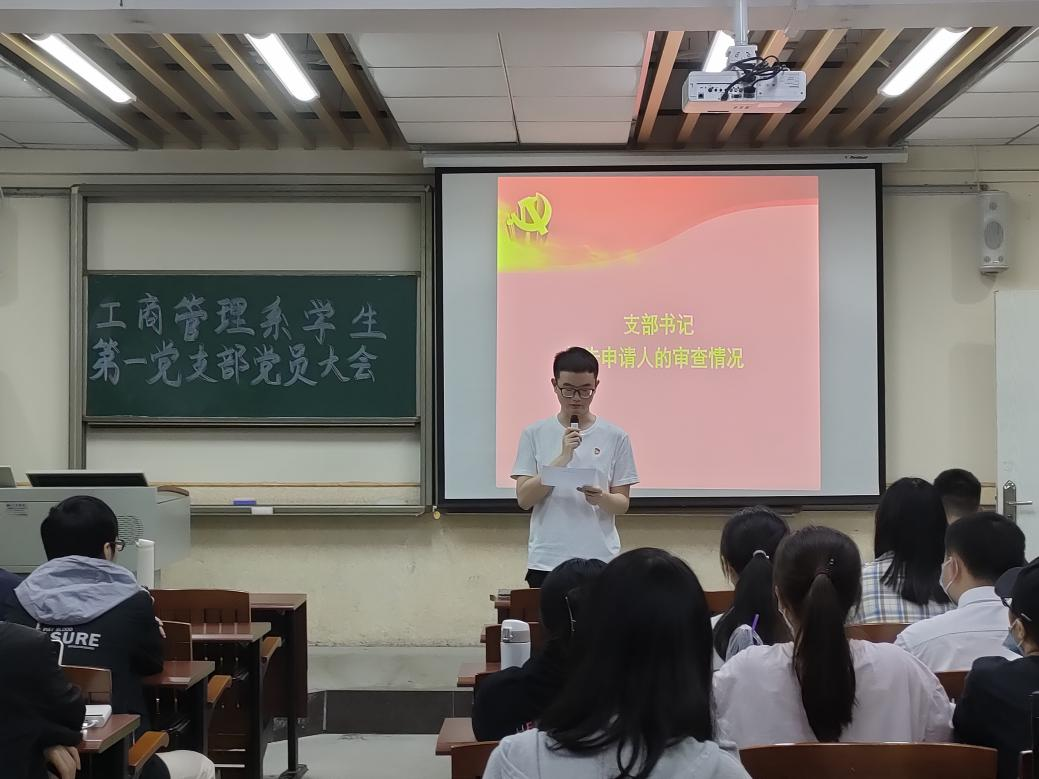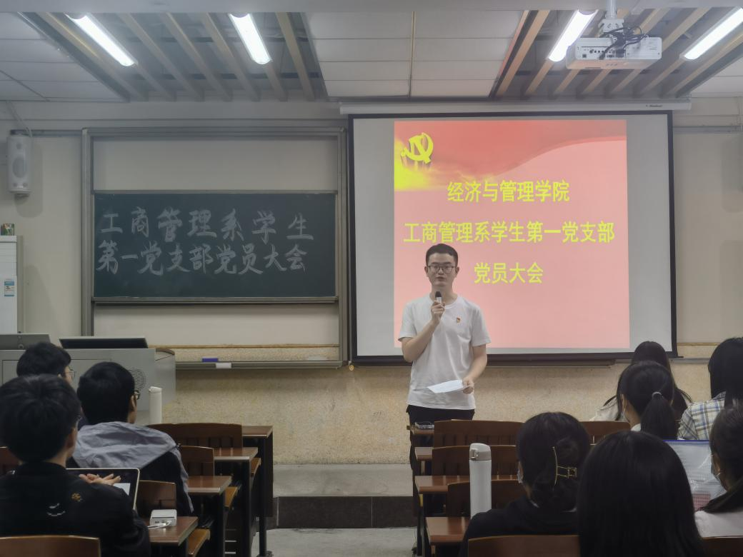 2021年11月15日下午,经济与管理学院工商管理系学生第一党支部于莞城校区3308课室顺利召开支部党员大会,讨论接收预备党员的事宜。经济与管理学院党委副书记黄湘、工商管理系学生第一党支部书记刘文渊以及全体学生党员参与了此次大会。