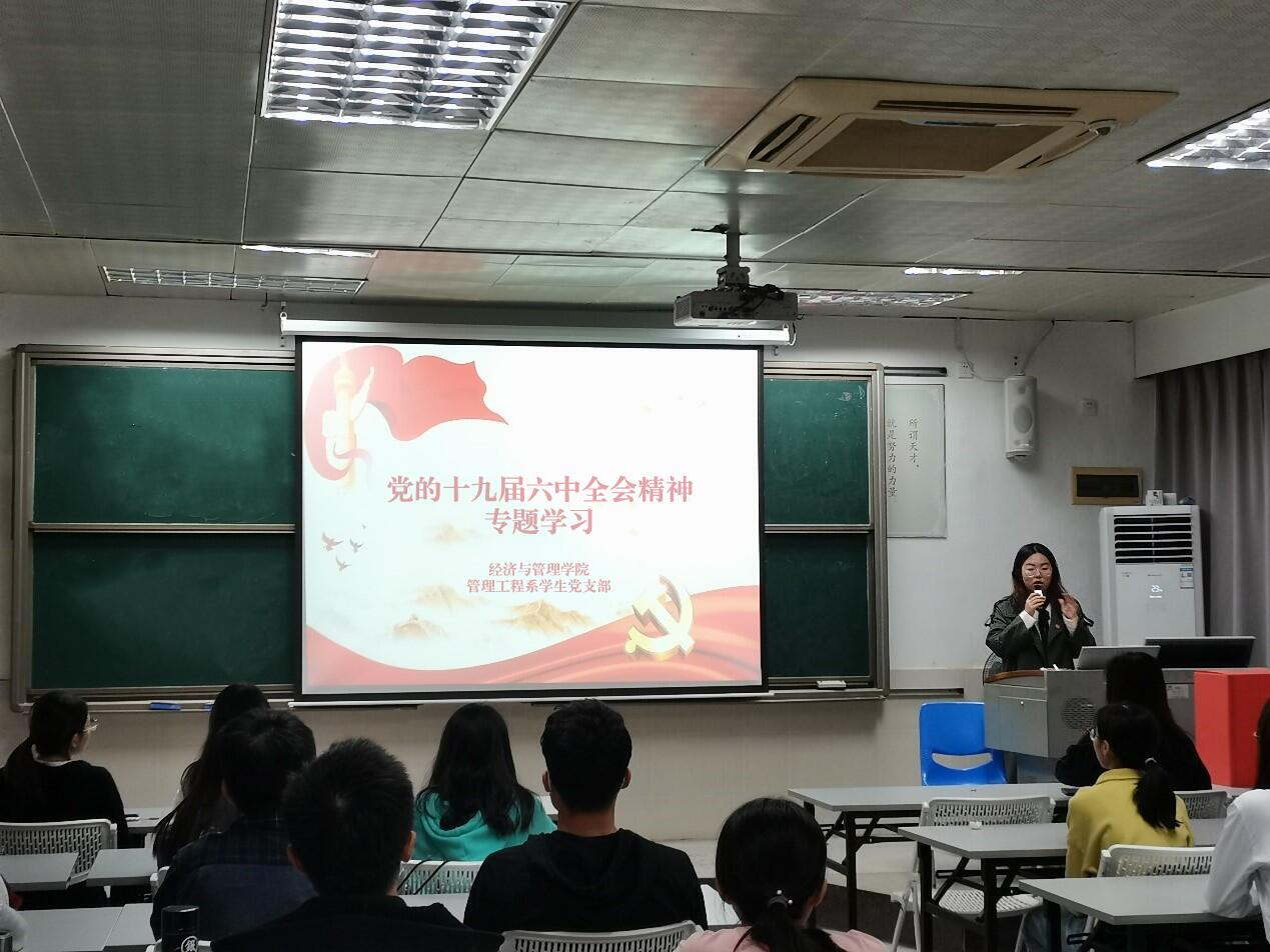 2021年11月18日,经济与管理学院管理工程系学生党支部于莞城校区3402教室学习贯彻党的十九届六中全会精神。本次学习由支部书记杨梅青主持,支部全体学生党员出席了现场。