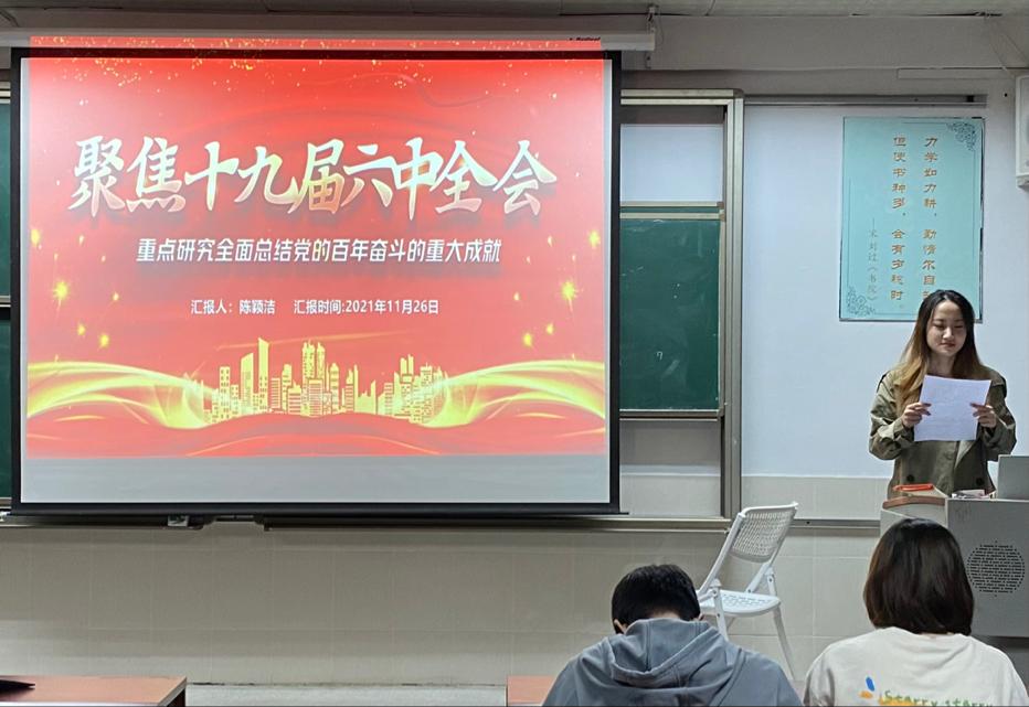支部书记周兆鸿传达了校党委关于学习贯彻落实党的十九届六中全会精神的指示,并带头分享了学习心得。他指出,党的十九届六中全会是在建党百年、以及向第二个百年奋斗目标迈进的关键时间节点召开的一次重要会议。会议总结了百年奋斗的重大成就和历史经验,并形成了新的历史决议,意义非同寻常,将对中国发展的历史进程产生重大且深远的影响。党员们应当在学习中深刻领会党的十九届六中全会精神,透过现象看本质,从会议总结的成功历史中获得经验,在学习中充分领会十九届六中全会的伟大精神,肩负起青年党员应尽的责任。