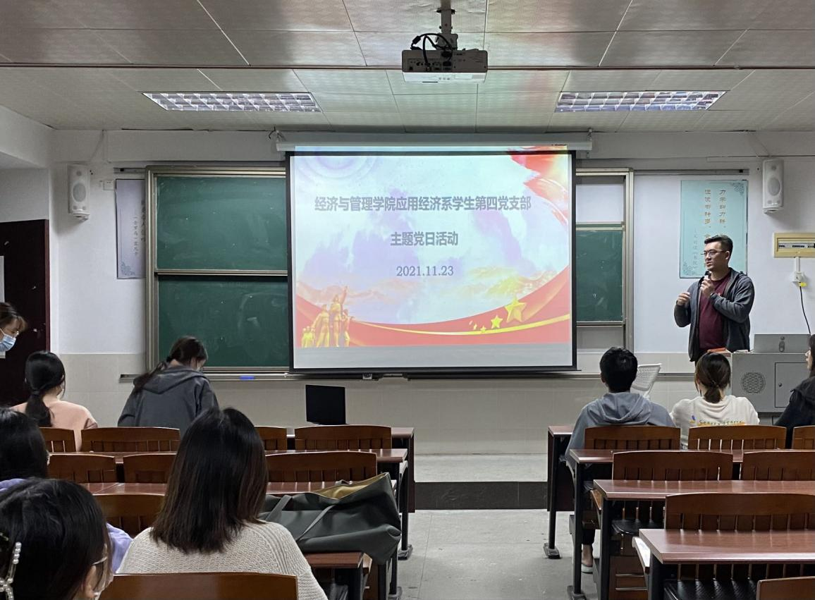 11月23日,经济与管理学院应用经济系学生第四党支部于莞城校区3401教室召开党员会议,学习贯彻习近平总书记在党的十九届六中全会上的重要讲话和全会决议精神。支部书记周兆鸿和支部全体学生党员参与了学习。