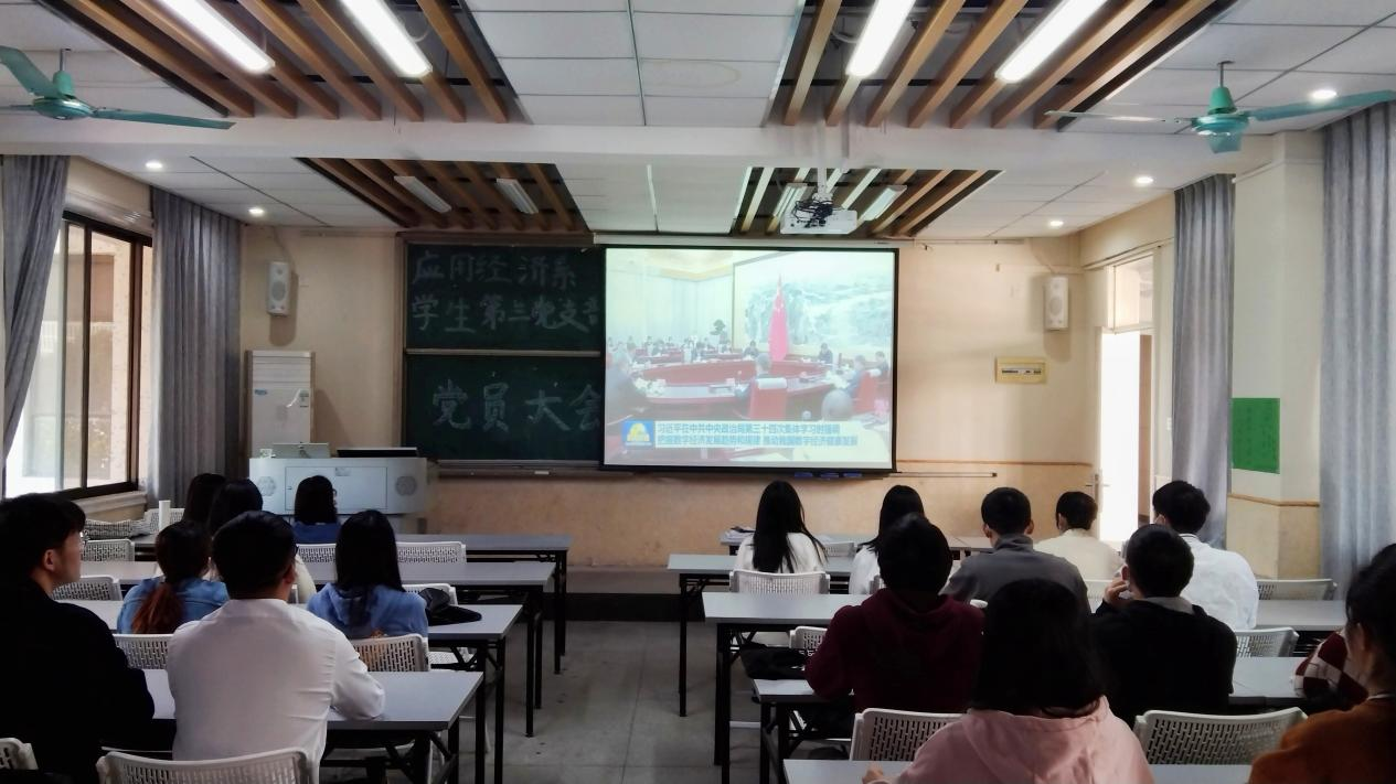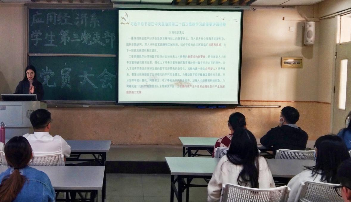 2021年12月7日,经济与管理学院应用经济系学生第三党支部于莞城校区3303课室召开党员会议,学习贯彻习近平总书记在中央政治局第三十四次集体学习的重要讲话精神。支部书记叶琦玮和全体学生党员参与了学习。
