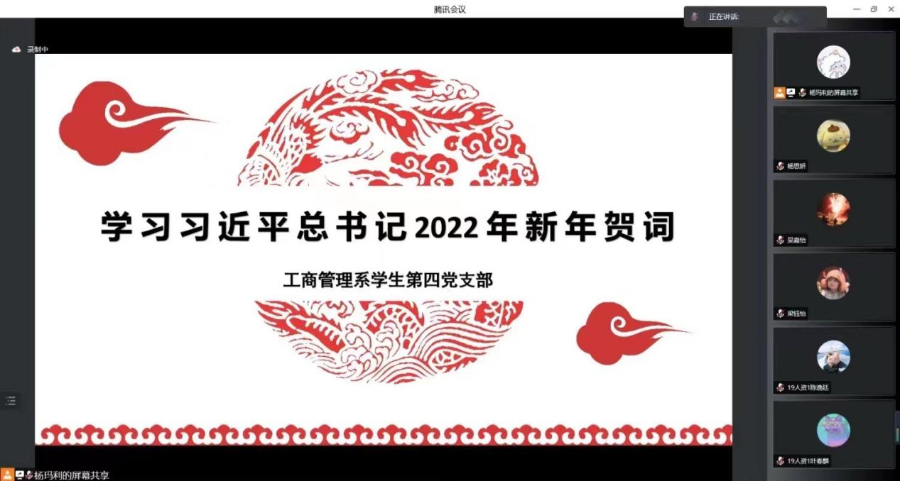 2月20日晚,经济与管理学院工商管理系学生第四党支部召开支部线上会议,学习习近平总书记2022年新年贺词。支部书记邓毅青和全体学生党员参与了学习。