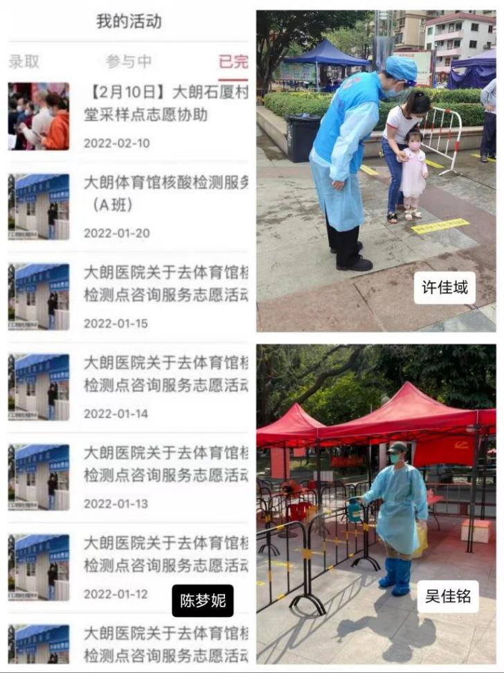 入党积极分子吴佳铭是一名退伍军人,在大朗镇开展核酸检测时,与同为退伍军人的父亲一起参加了防疫志愿者工作,展现出退役不褪色的担当;另一位也居住在大朗镇的入党积极分子陈梦妮,今年已参与了8次核酸检测志愿服务,用实际行动为筑牢人民群众生命安全线而努力;许佳域同志与林欣平同志亦是如此,分别参加了所在地区的防疫服务工作,人员疏导、协助扫描核酸码等,展现出真诚奉献的青春底色。
