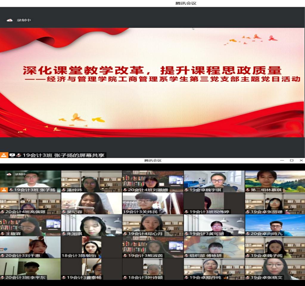 2022年3月19日,经济与管理学院工商管理系学生第三党支部顺利开展了“深化课堂教学改革 提升课程育人质量”线上主题党日,本次党日由支部书记黄雅莉同志主持,全体学生党员参与活动。
