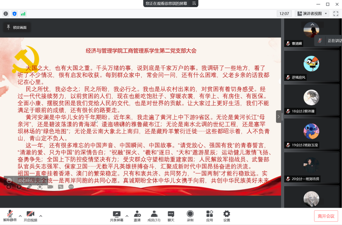 1月20日下午,经济与管理学院工商管理系学生第二党支部召开支部线上会议,学习习近平总书记2022年新年贺词。支部书记熊涛和全体学生党员参与了学习。