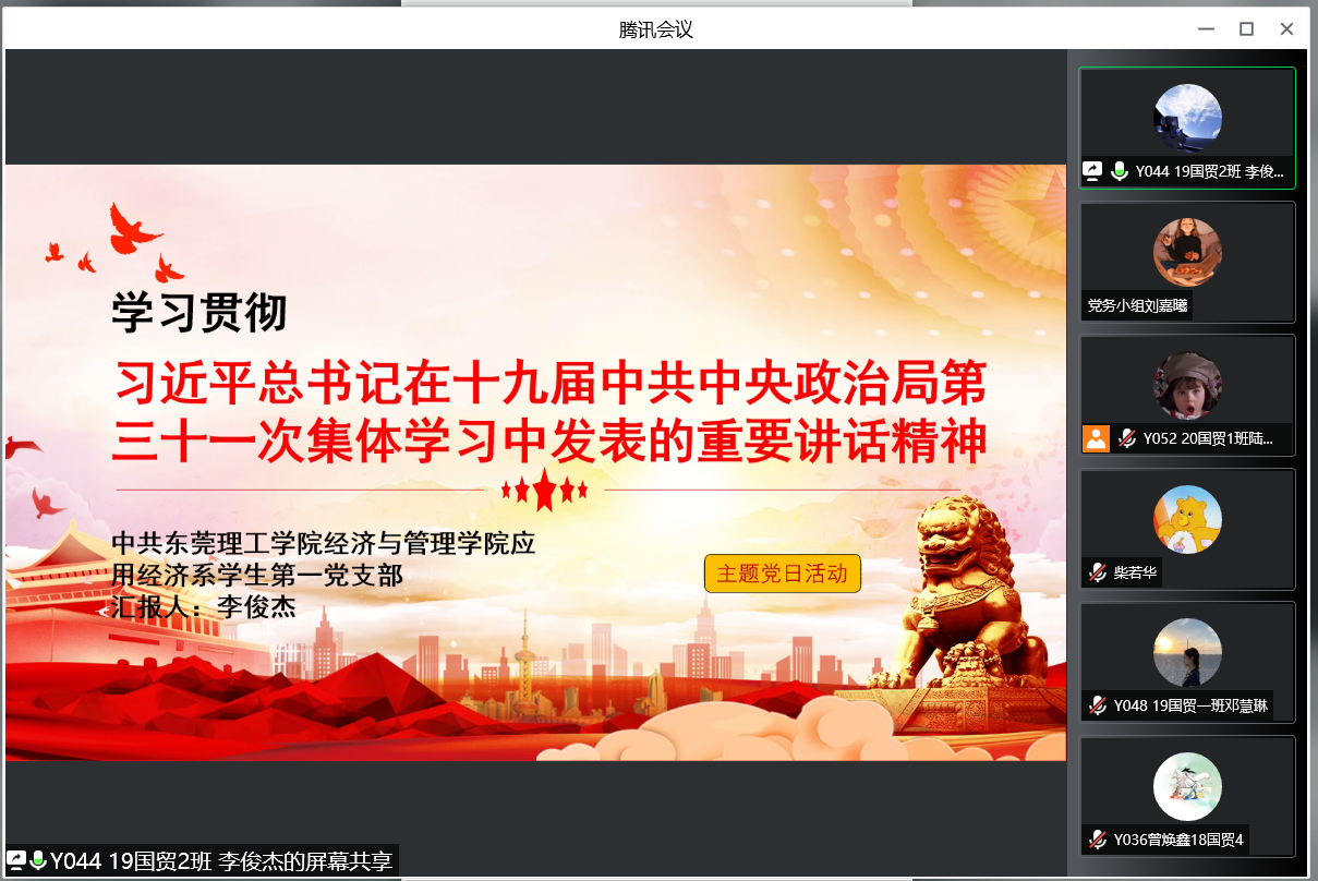 2月10日,经济与管理学院应用经济系学生第一党支部学习贯彻习近平总书记在十九届中共中央政治局第三十一次集体学习时的重要讲话精神。