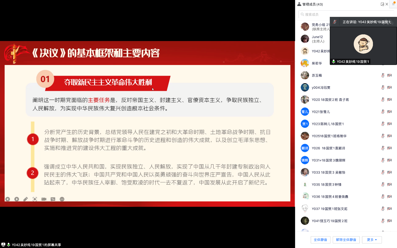 1月27日,经济与管理学院应用经济系学生第一党支部深入学习了《中共中央关于党的百年奋斗重大成就和历史经验的决议》(以下简称《决议》),会议采取线上学习的方式进行,全体党员参与了学习。
