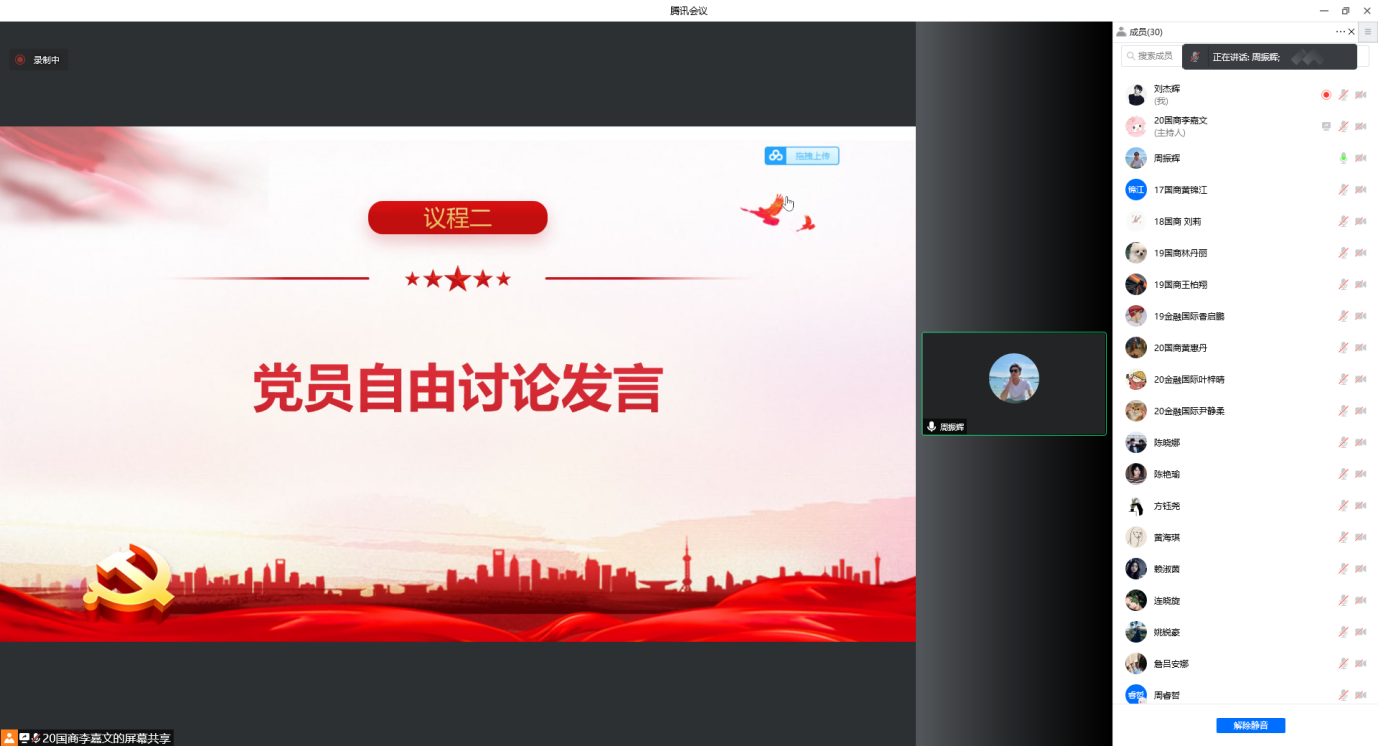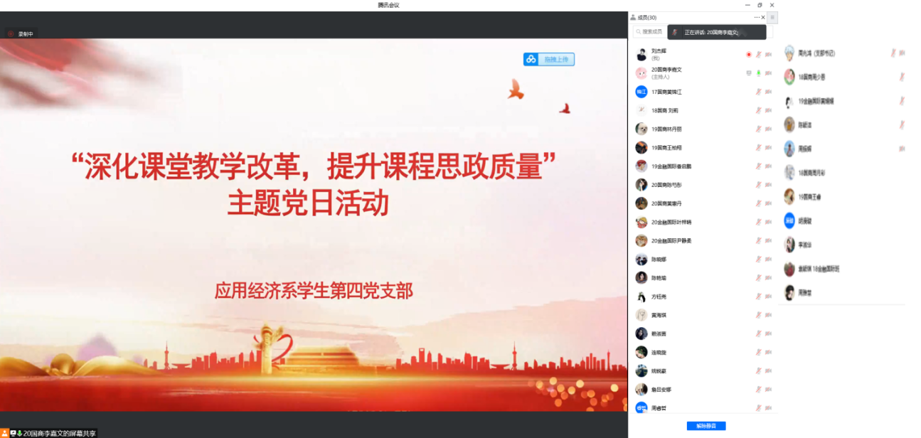 2022年3月25日,经济与管理学院应用经济系学生第四党支部围绕“深化课堂教学改革,提升课程思政质量”主题顺利开展了线上主题党日,支部书记周兆鸿和全体学生党员参与了活动。