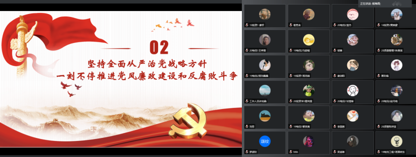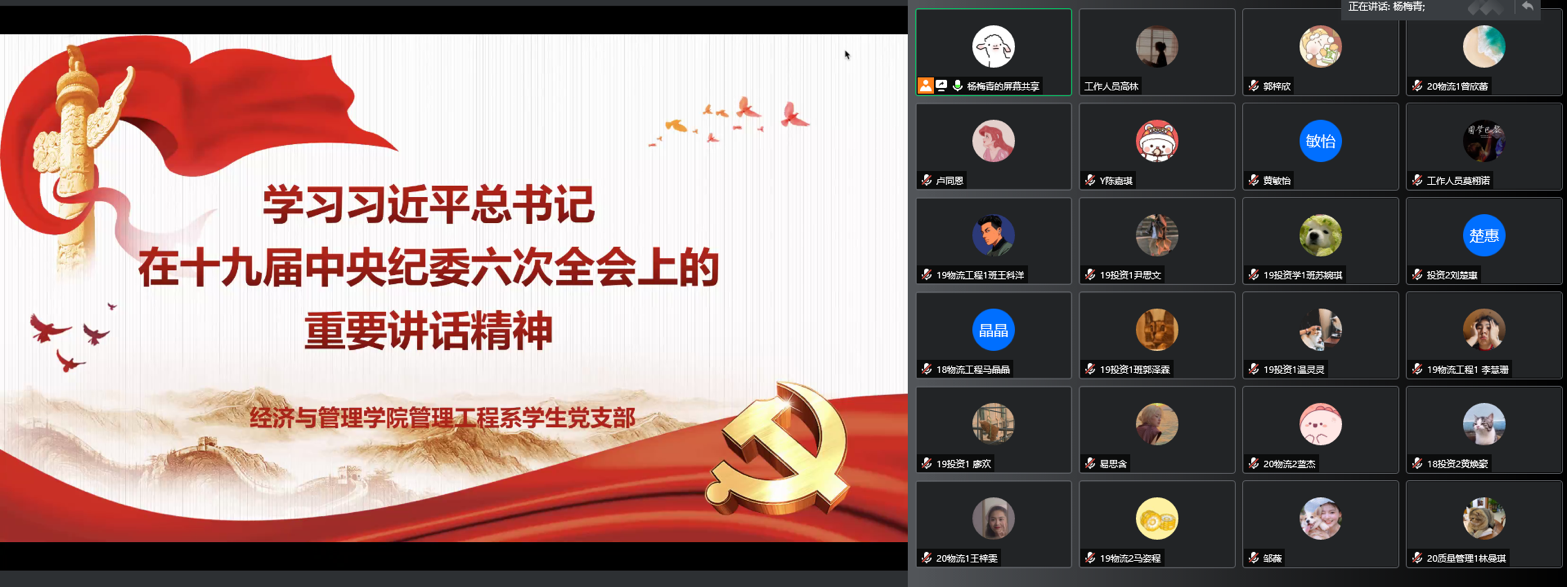 2022年3月25日,经济与管理学院管理工程系学生党支部顺利开展习近平总书记在十九届中央纪委六次全会上的重要讲话精神线上专题学习。支部书记杨梅青和全体学生党员参与了此次学习。