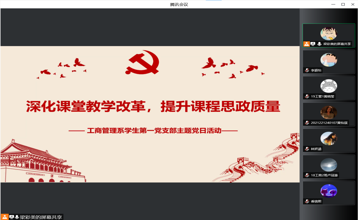2022年3月31日下午,经济与管理学院工商管理系学生第一党支部组织举行“深化课堂教学改革,提升课程思政质量”线上主题党日,经济与管理学院党委副书记黄湘,工商管理系学生第一党支部书记刘文渊及全体党员参与了此次会议。