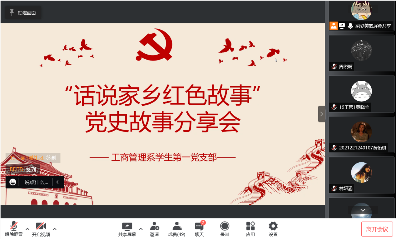 为深化党史学习教育,鼓励、引导学生党员在探索家乡红色故事中传承先辈红色基因,3月31日下午,工商管理系学生第一党支部开展“话说家乡红色故事”线上党史故事分享会,经济与管理学院党委副书记黄湘、工商管理系学生第一党支部书记刘文渊及全体学生党员参加了本次分享会。