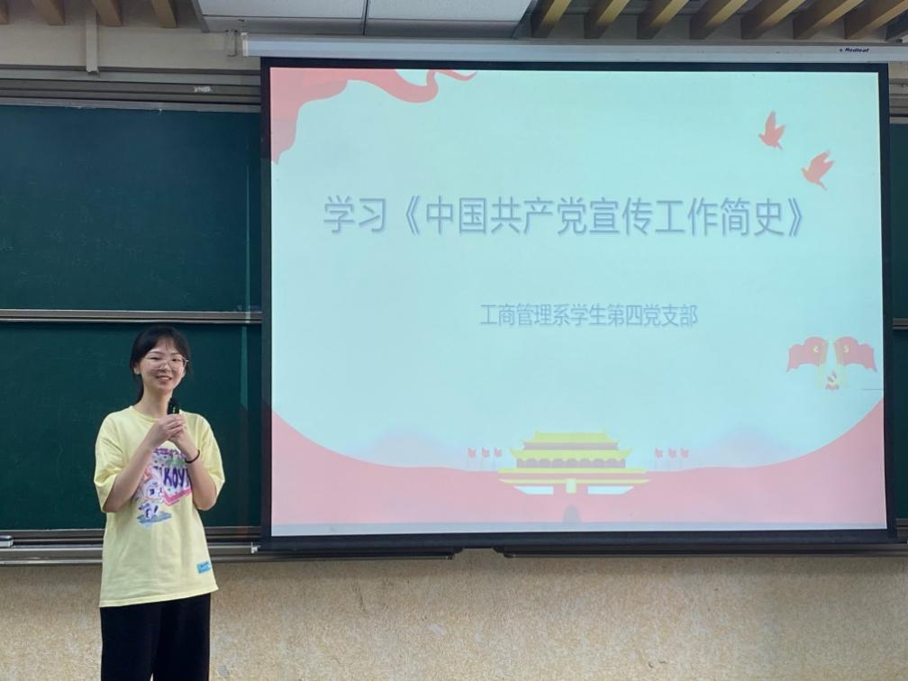 5月28日下午,经济与管理学院工商管理系学生第四党支部于莞城校区3309教室组织集中学习《中国共产党宣传工作简史》,进一步加深对习近平总书记关于意识形态工作重要论述的领会和理解,从党的百年宣传工作史中赓续精神血脉、汲取奋斗力量。支部书记邓毅青和全体学生党员参与了学习。