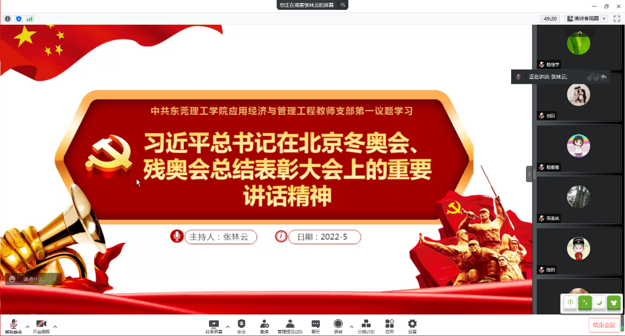2022年5月12日,经济与管理学院应用经济与管理工程教师党支部召开线上会议,深入学习贯彻习近平总书记在北京冬奥会、冬残奥会总结表彰大会上的重要讲话精神。