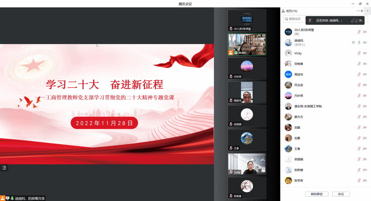为深入学习宣传贯彻党的二十大精神,2022年11月28日晚上,工商管理教师党支部开展了以“学习二十大 奋进新征程”为主题的线上专题党课,由支部副书记程守红授课,支部16名党员教师参与了学习。