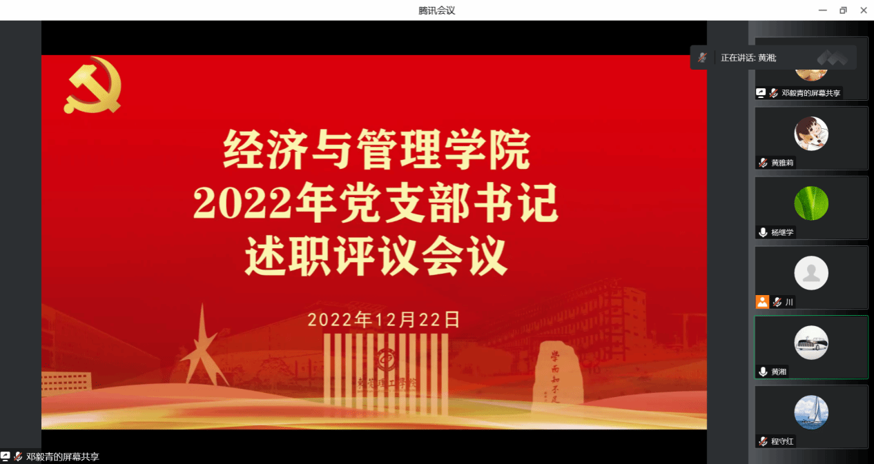为学习贯彻落实党的二十大精神,提升党建引领基层治理效能,12月22日下午,经济与管理学院召开了线上党支部书记述职评议会议,学院领导班子成员和全体支部书记参加了会议。会议由学院党委书记杨继学主持。