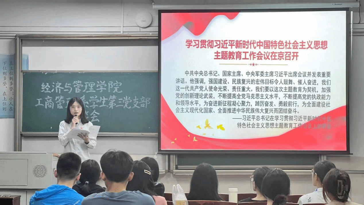 为深入学习习近平总书记在中央主题教育工作会议上的重要讲话精神、习近平总书记在广东视察时的重要讲话重要指示精神,传达广东省主题教育工作会议精神、学校主题教育动员部署会议精神,推动支部主题教育工作走深走实,经济与管理学院工商管理系学生第三党支部开展“分享入党初心,讲述专业魅力”主题党日,推出“早教育、早启蒙、早引导”的一系列举措,切实提高发展党员质量。