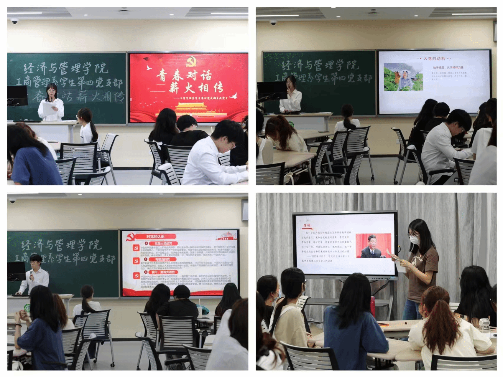 自学习贯彻习近平新时代中国特色社会主义思想主题教育开展以来,工商管理系学生第四党支部始终坚持“学思想、强党性、重实践、建新功”的总要求,以“青言青行”支部党建品牌推动支部主题教育走深走实。本月支部聚焦毕业季时间节点、结合支部党员需求调研情况,6月15日,在莞城校区开展了“青春对话 薪火相传”主题党日。