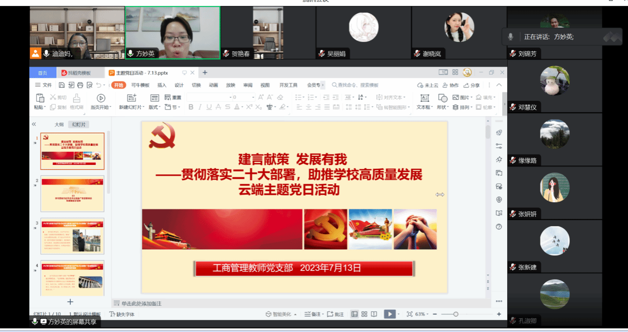 为了进一步贯彻落实党的二十大精神和习近平总书记视察广东重要讲话、重要指示精神,推动主题教育走深走实,7月13日,工商管理教师党支部开展了“建言献策 发展有我——贯彻落实党的二十大部署,助推学校高质量发展”云端主题党日。经济与管理学院党委书记路晓军、组织员梁建川、工商管理教师党支部全体党员参加了此次主题党日。支部书记方妙英同志主持会议。