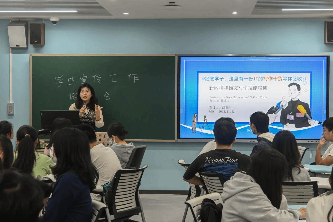 11月23日,学院邀请文传学院胡嘉琪老师围绕新闻稿和推文写作技能为学生党务干部进行授课。