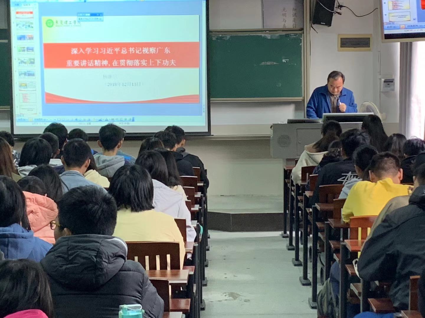 12月12日下午,经济与管理学院党总支书记杨继学在莞城校区3407教室,向学院师生讲授深入学习贯彻习近平总书记视察广东重要讲话精神专题党课。