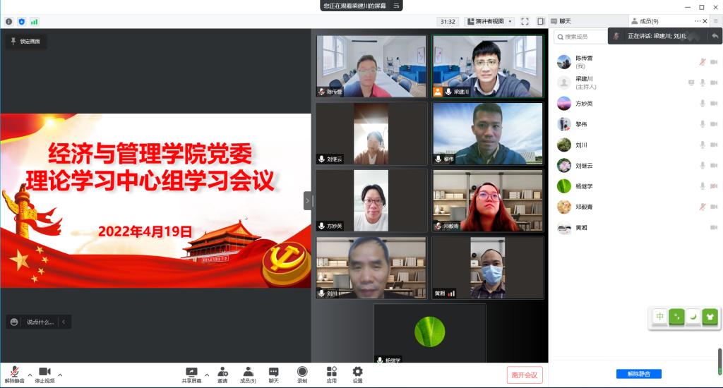 4月19日下午,经济与管理学院党委理论学习中心组深入学习领会习近平总书记关于中国式现代化道路的重要论述。会议采取线上的方式,由学院党委书记杨继学主持,学院院长刘继云、副院长刘川、黎伟,党委副书记黄湘等参与了学习。