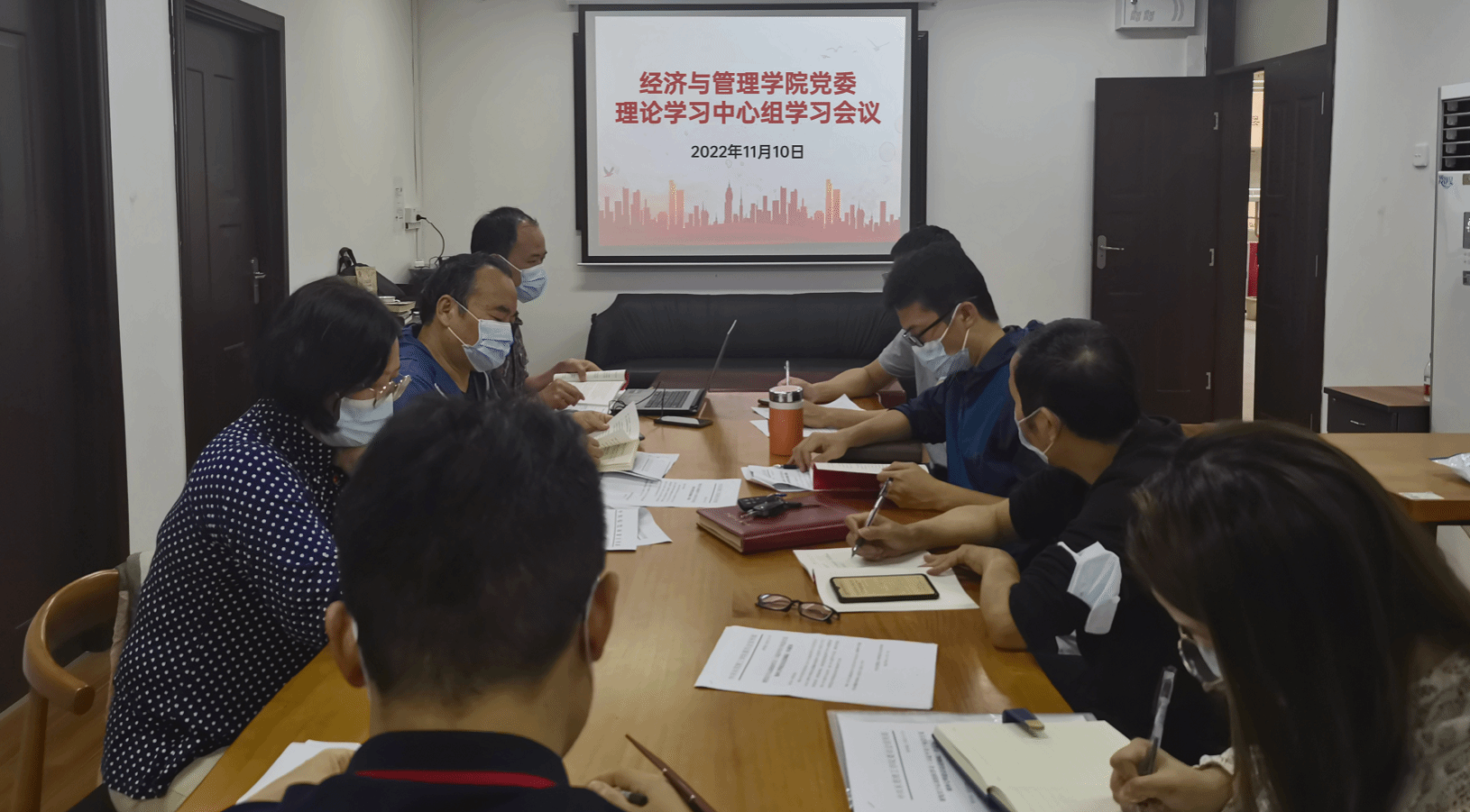 11月10日下午,经济与管理学院党委理论学习中心组于莞城校区4418会议室召开学习贯彻党的二十大精神专题学习会,集中学习《习近平关于社会主义精神文明建设论述摘编》。经济与管理学院党委书记杨继学主持会议,院长刘继云,副书记黄湘,副院长刘川、黎伟等成员参与了学习研讨。