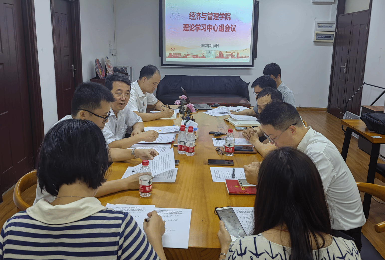 9月6日下午,经济与管理学院党委理论学习中心组于莞城校区4418会议室举行主题教育专题民主生活会会前集体学习研讨。会议由学院党委书记路晓军主持,党委副书记黄湘,副院长刘川、黎伟等中心组成员参会。