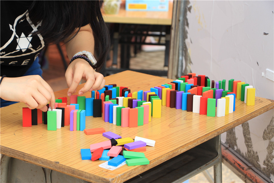 工作人员认真摆放多米诺