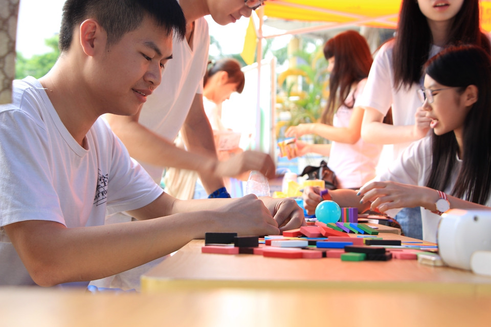 5月18日下午,为增强莞工学子的团员意识,经济与管理学院团总支、学生会组织部主办的“我有我智慧,创意多米诺”团日活动于莞城校区图书馆前空地举行。活动现场氛围热闹,吸引众多学子前来参与。