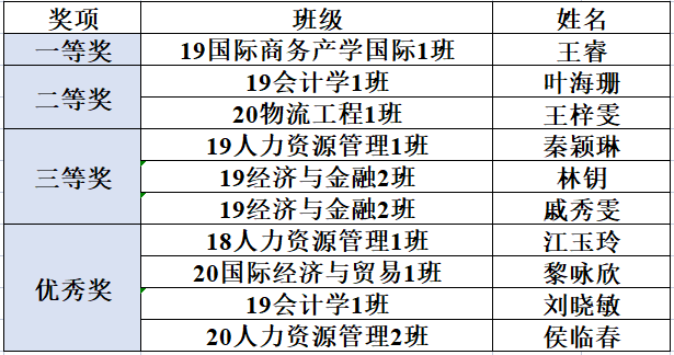 其中19国际商务产学国际1班的王睿同学荣获一等奖,19会计1班的叶海珊、20物流工程1班的王梓雯同学荣获二等奖,19经济与金融2班的林钥、戚秀雯同学19人力资源管理1班的秦颖琳荣获三等奖,18人力资源管理1班的江玉玲、19国际经济与贸易1班的黎咏欣19会计1班的刘晓敏、20人力资源管理2班的侯临春同学荣获优秀奖。