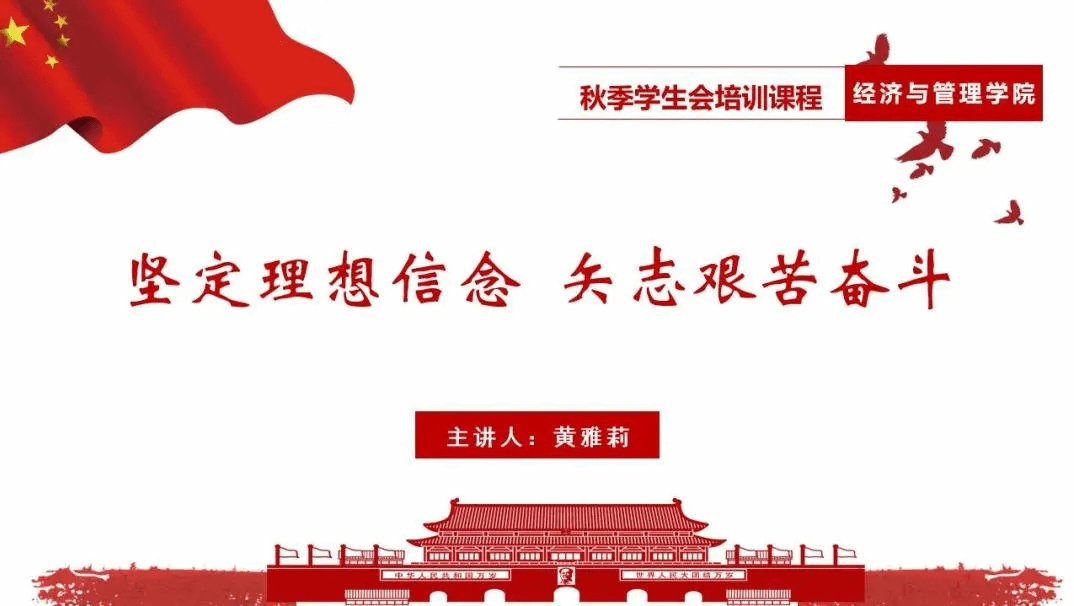 本次培训黄雅莉老师以“坚定理想信念,矢志艰苦奋斗”为主题向大家授课。培训伊始,黄雅莉老师带领同学们一起学习了全国学联二十七大会议精神及习近平总书记致全国青联十三届委员会和全国学联二十七大的贺信精神,指出学联学生会要坚持以习近平新时代中国特色社会主义思想为引导,深入贯彻习近平总书记关于青年工作的重要思想,聚焦主责主业,锐意改革进取,坚定不移走中国特色社会主义群团发展道路,并引导大家坚定理想信念,矢志艰苦奋斗,要做有理想、敢担当、能吃苦、肯奋斗的新时代好青年。黄雅莉老师强调,学生骨干作为新时代的中国青年需要用理想信念武装头脑,用扎实过硬的本领武装身体,唯此才能成为勇担责任,砥砺奋进的时代先锋。最后,黄雅莉老师寄语学生干部:“青春由磨砺而出彩,人生因奋斗而升华。”由此祝愿经管学院学生会全体工作人员能够乘风破浪,奋勇前行,在未来的学习与工作生活中发扬出“经管人”的光彩。