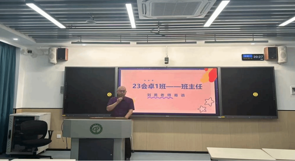 此次班会特邀班主任刘勇老师、22级会卓1班长梁梦宁、21级会计1班班长李帅及18级会卓1班长林庆勋参与,通过视频连线与现场分享的形式,为同学们带来关于学习规划、职业路径及安全防范的精彩演讲。班会在班主任刘勇老师的致辞中拉开帷幕,刘勇老师特别强调了新学期学习生活的规划重要性,鼓励同学们树立远大目标,努力提高自身综合素质。
