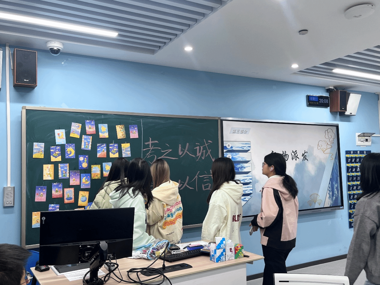 之后班委团取出先前准备的精美贺卡,以“开盲盒”形式发放给同学们,上面记录同学们对彼此的期末祝福和对未来的衷心祝愿,同学们依次抽取自己的贺卡和新年小礼物,快乐之余,主持人带头鼓励大家大声说出自己的新年愿望,整个教室洋溢着欢乐的气息和对未来美好的期许。