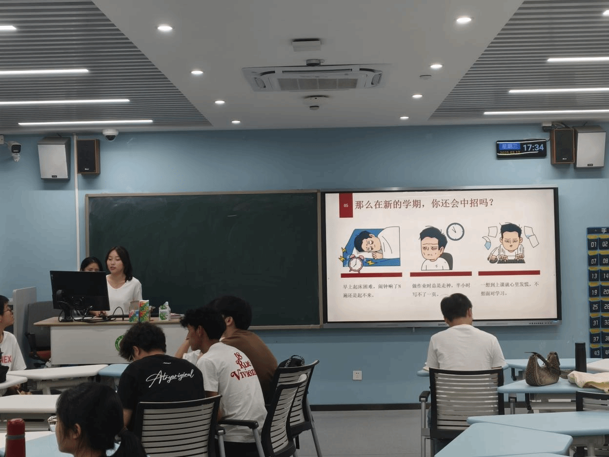 班会伊始,学习委员对班级学业情况进行系统总结。数据显示班级挂科率仅为0.03%,但仍存在作业拖延、早读迟到、小组合作效率不足等问题。针对这些情况,班委提出“挂科清零”方法,通过 “让我帮你诊断一下” 互动环节分析作息混乱、学习分心等典型问题,结合具体案例提出“调整作息”、“番茄工作法 ”和“互助监督”等个性化解决方案。