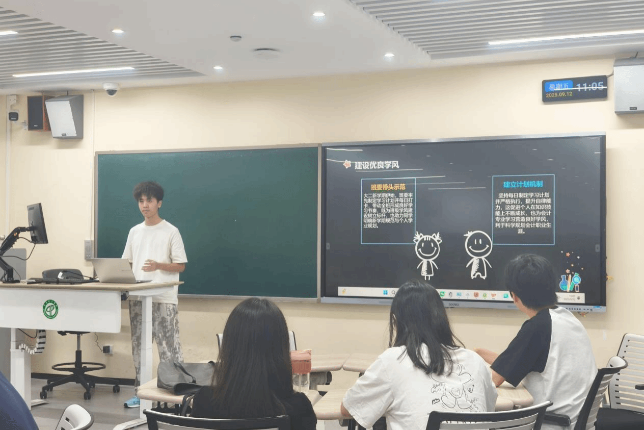 为助力学生锚定学业方向、筑牢安全防线、践行绿色理念,9月12日,学院24级会计学2班在3309课室召开以“开学规划明方向,安全环保筑新章”为主题的九月主题班会。本次班会在班主任刘川老师的指导下,班长黄燕丽带领班委团队精心组织,通过“规划引领、安全护航、环保践行”三大板块,为班级新学期发展注入成长动能。
