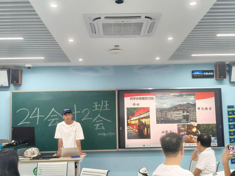 为热烈庆祝中华人民共和国成立76周年,深入推进“中华民族共同体意识”教育,10月14日,学院24级会计学2班在莞城校区教学楼3209教室举行“爱国笃行庆华诞,民族团结共奋进”主题班会。本次班会由班长黄燕丽主持, 班主任刘川老师以及全班同学参加班会。