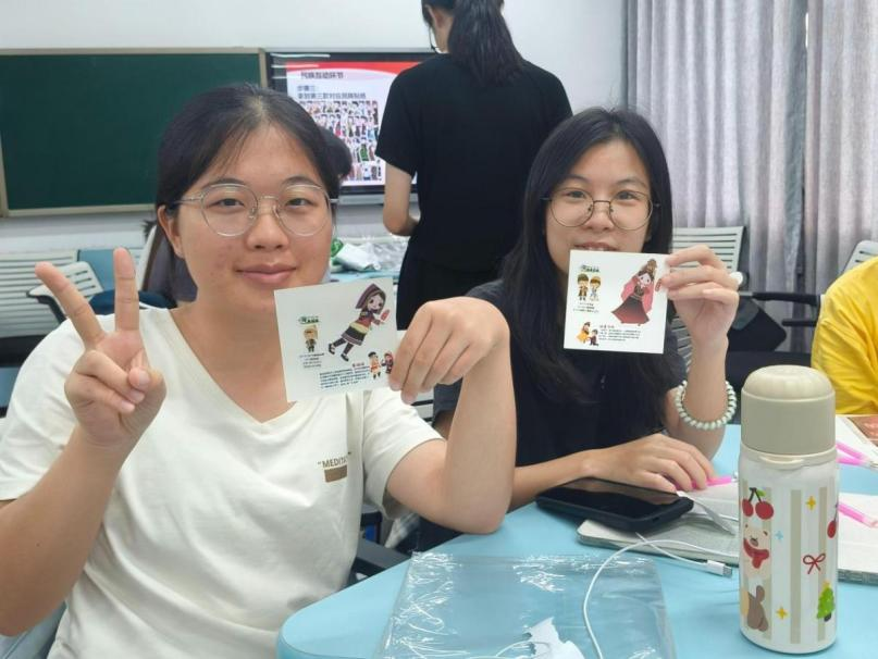 在民族团结篇章,文体委员万嘉怡系统介绍我国56个民族的风俗文化,藏族同学次仁顿珠围绕转经信仰、布达拉宫历史、酥油茶习俗作精彩分享,加深班级同学们对民族文化的认识。现场还设置“民族贴纸探寻”互动环节,同学们随机抽取哈萨克族、侗族、塔塔尔族等贴纸,通过“查资料—写寄语—贴拼图画”的方式,进行了一次 “行走的思政课”。