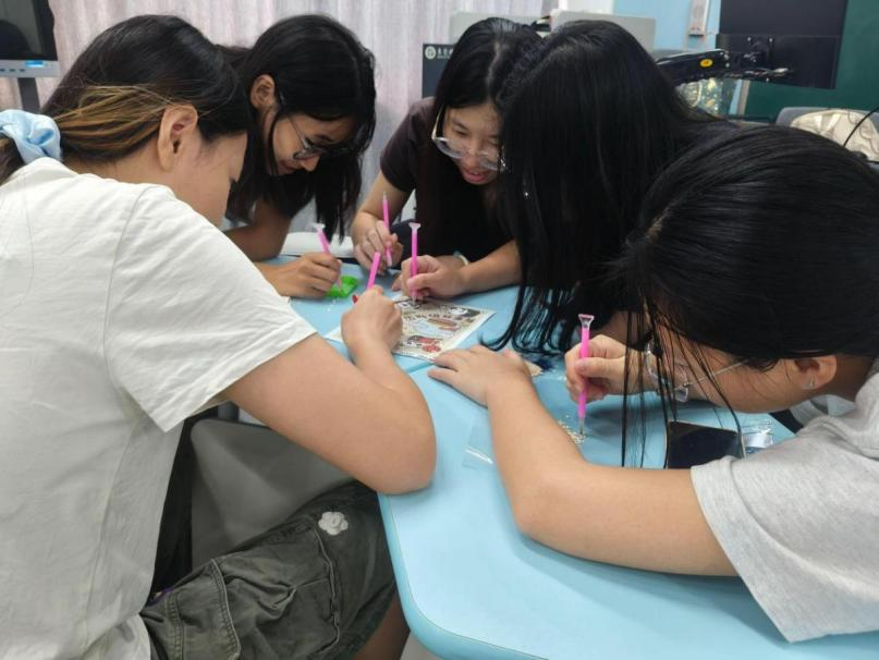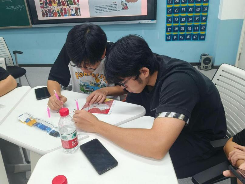 班会分“爱国情·强国志·报国行——庆祝中华人民共和国成立76周年”和“中华民族一家亲,同心同行共奋进”两大篇章依次展开。首先,组织委员翟凯盈以时间为轴,用详实数据与鲜活案例带领同学们回顾新中国“站起来—富起来—强起来”的光辉历程;随后,全班分组开展“钻石画”手工创作,以“天安门”、“五星红旗”等五幅爱国主题图样为载体,将强国志、报国行“贴”进心田。