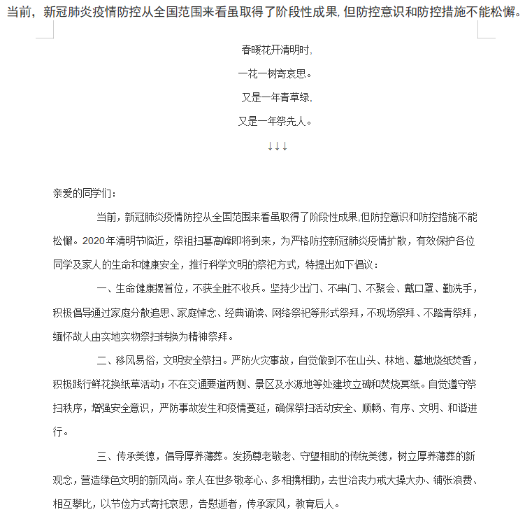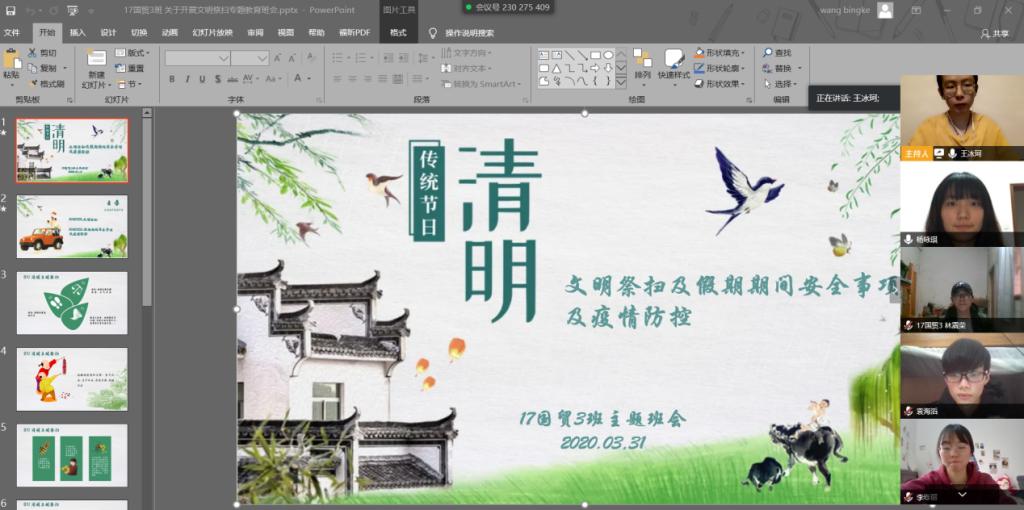 在专题班会上,各班团支书总结了当前国内疫情形势,呼吁同学们应该做好疫情成果的守护者,各班班长在视频会议上讲到在疫情期间祭祀应该重在心意,不拘泥于形式,呼吁同学们线上祭祀,守护好疫情防控成果。