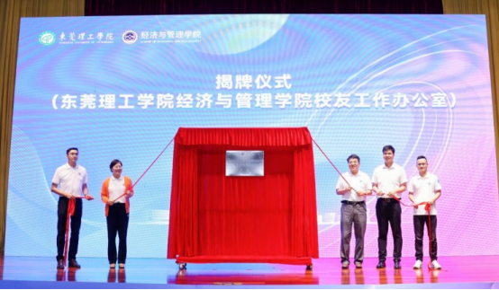 学院领导和校友代表上台为全校首个二级学院校友工作办公室——经管校友工作办公室揭牌。