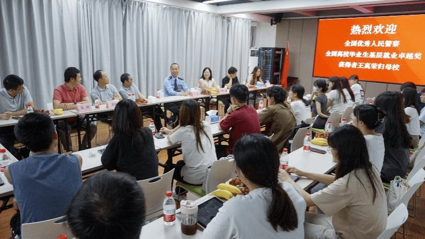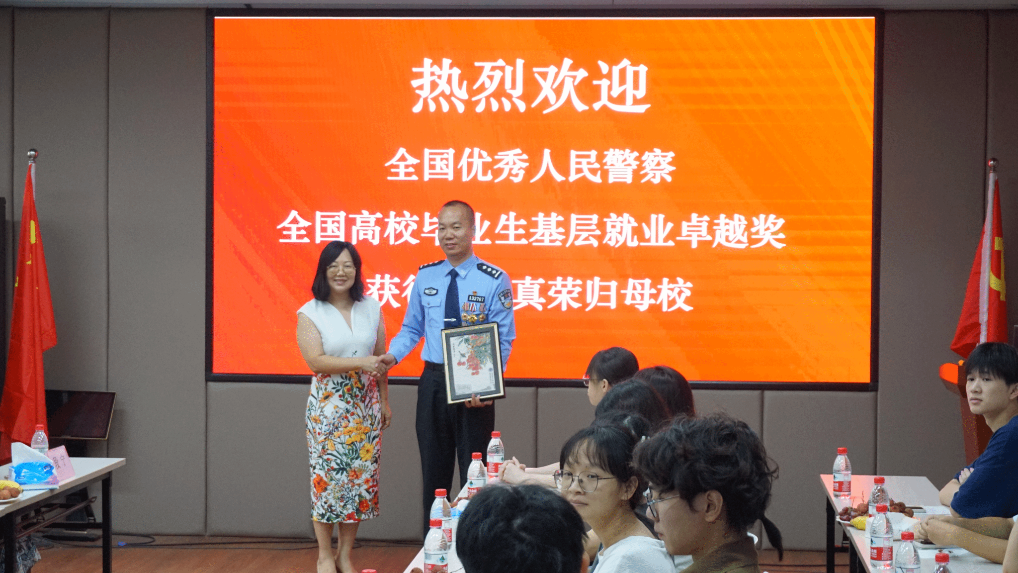 他分享了自己毕业后的工作经历和收获的成绩。着重讲述了自己率队深入罗布泊,侦破特大盗窃倒卖文物专案的案例,并与大家分享了中央电视台《今日说法》栏目组对他们专案组的专访,令在座师生倍受震撼,心生敬意,他表示,既然头顶警徽,就要担负得起使命,既然身着警服,就要扛得起人民的信任与托付。他说,再危险再艰难的工作也得有人站出来去做,他引用习近平总书记对青年的寄语勉励大家,要有家国情怀,要珍惜韶华,勤奋学习,要争做有理想、敢担当、能吃苦、肯奋斗的新时代好青年。