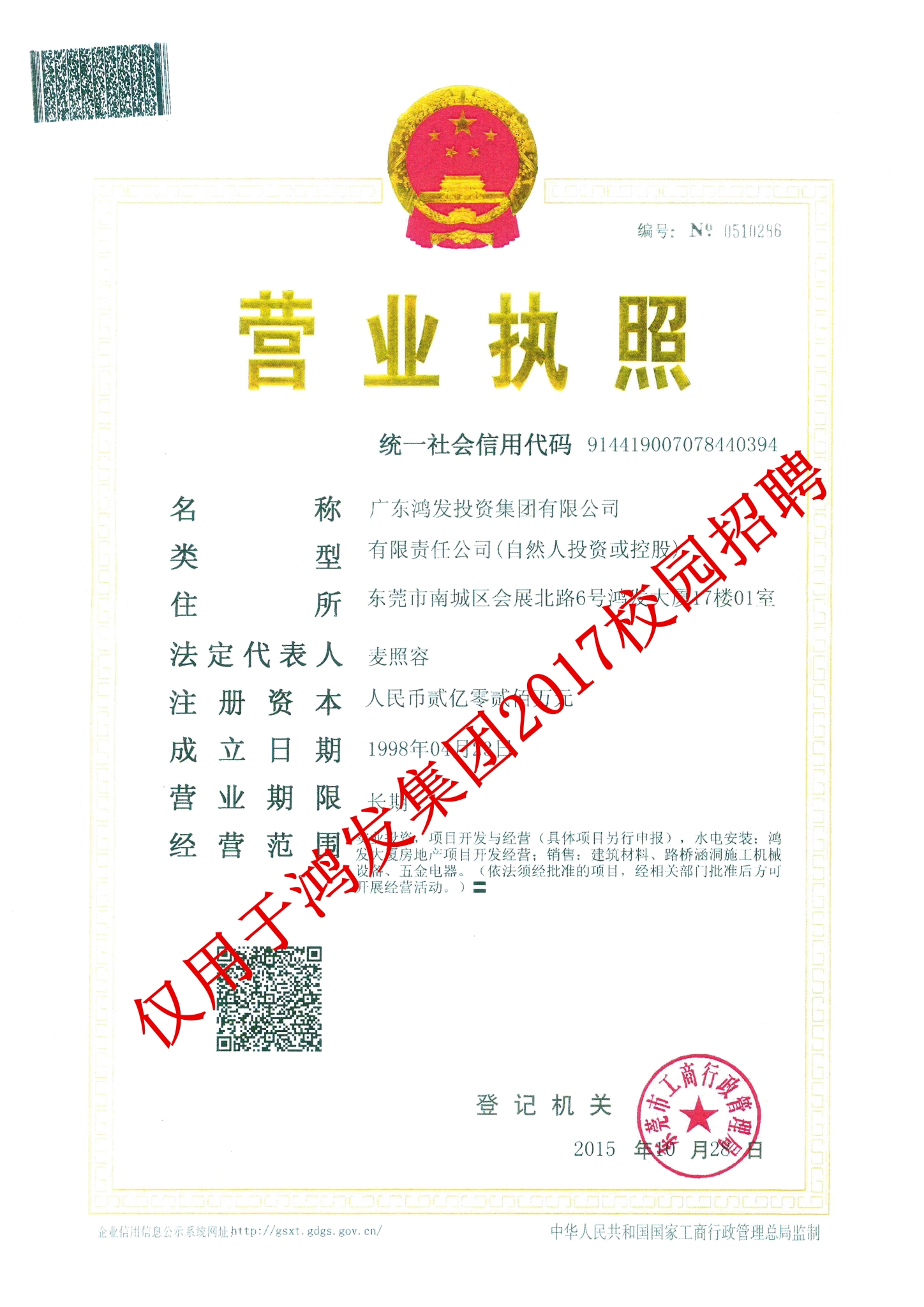 广东鸿发投资集团有限公司前身成立于1980年,现已发展成为一家以实业为基础的现代化大型企业集团,旗下拥有广东鸿高建设集团、广东鼎峰地产集团、广东鸿发教育文化集团3家二级集团公司,30多家多级子公司,业务领域涉及市政投资与建设、房地产开发、文化教育、金融服务、健康生态等五大产业板块,总资产近200亿。